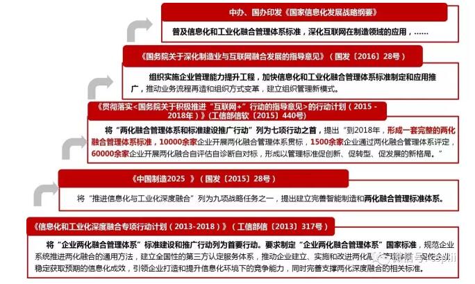 随着《国家信息化发展战略纲要》、《国务院关于深化制造业与互联网融合发展的指导意见》、《关于贯彻落实<国务院关于积极推进“互联网+”行动的指导意见>的行动计划(2015-2018年)》等的发布和实施,两化融合管理体系贯标工作的重要意义日益凸显。《国家信息化发展战略纲要》明确提出要“普及信息化和工业化融合管理体系标准,深化互联网在制造领域的应用,积极培育众创设计、网络众包、个性化定制、服务型制造等新模式,完善产业链,打造新型制造体系”。《国务院关于深化制造业与互联网融合发展的指导意见》指出要“组织实施企业管理能力提升工程,加快两化融合管理体系标准制定和应用推广,推动业务流程再造和组织方式变革,建立组织管理新模式”。《中国制造2025》中明确指出要“建立完善两化融合管理标准体系”。《工业和信息化部关于贯彻落实<国务院关于积极推进“互联网+”行动的指导意见>的行动计划(2015-2018年)》将“两化融合管理体系和标准建设推广行动”列为首要行动,并明确提出“到2018年,形成一套完整的两化融合管理体系标准,10000余家企业开展两化融合管理体系贯标,1500余家企业通过两化融合管理体系评定,60000余家企业开展两化融合自评估自诊断自对标,形成以管理标准促创新、促转型、促发展的新格局”。