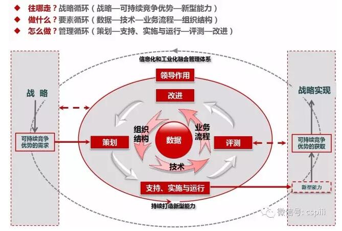 两化融合管理体系借鉴以往成熟管理体系做法,通过总结提炼几十年来我国广大企业信息化、企业管理等方面的实践经验、规律和方法,形成的一套规范企业系统推进两化融合的过程管理机制和方法,充分吸收了互联网时代制造业发展的新理念、新要素、新规律,对新时期企业两化融合的内涵和外涵作出了创新性阐释,对企业两化融合工作的推进机制和管理方法提出了明确要求,相关要求主要围绕企业两化融合往哪走、做什么、怎么做三个核心问题提出——一是往哪儿走,企业应围绕战略、可持续竞争优势、信息化环境下新型能力等的识别与获取,形成有效的管理机制,以准确定位两化融合工作的方向、衡量两化融合工作的成效;二是做什么,企业应面向新型能力打造,围绕数据、技术、业务流程、组织结构四个要素的有效互动与协同,形成有效的管理机制,以明确两化融合工作的主要任务和主要过程,确保拟打造的新型能力有效获取;三是怎么做,企业应从可持续竞争优势、领导作用、策划、支持、实施与运行、评测、改进等方面形成管理机制,以确保企业两化融合管理机制的闭环可靠和有效运转。