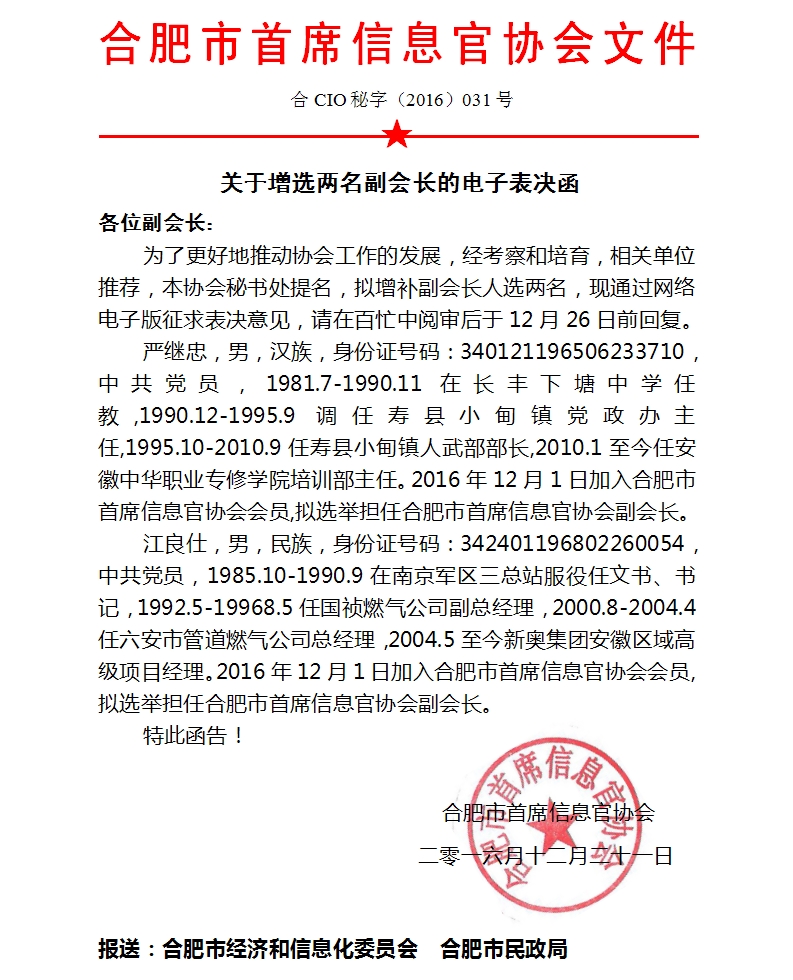 为了更好地推动协会工作的发展,经考察和培育,相关单位推荐,本协会秘书处提名,拟增补副会长人选两名,现通过网络电子版征求表决意见,请在百忙中阅审后于12月26日前回复。