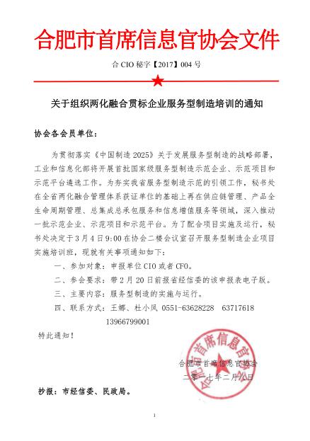 为贯彻落实《中国制造 2025》关于发展服务型制造的战略部署,工业和信息化部将开展首批国家级服务型制造示范企业、示范项目和示范平台遴选工作。为夯实我省服务型制造示范的引领工作,秘书处在全省两化融合管理体系获证单位的基础上再在供应链管理、产品全生命周期管理、总集成总承包服务和信息增值服务等领域,深入推动一批示范企业、示范项目和示范平台。为了配合项目实施及运行,秘书处决定于3月4日9:00在协会二楼会议室召开服务型制造企业项目实施培训班,现就有关事项通知如下: