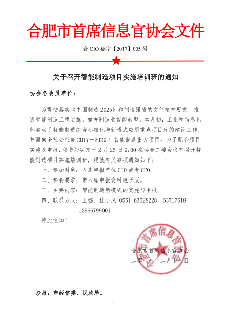 为贯彻落实《中国制造 2025》和制造强省的文件精神要求,推进智能制造工程实施,加快制造业智能转型,本月初,工业和信息化部启动了智能制造综合标准化与新模式应用重点项目库的建设工作,并面向全社会征集 2017-2020 年智能制造重大项目。为了配合项目实施及申报,秘书处决定于 2 月 25 日 9:00 在协会二楼会议室召开智能制造项目实施培训班,现就有关事项通知如下: