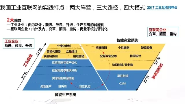 我国工业互联网的实践特点:两大阵营,三大路径,四大模式。
