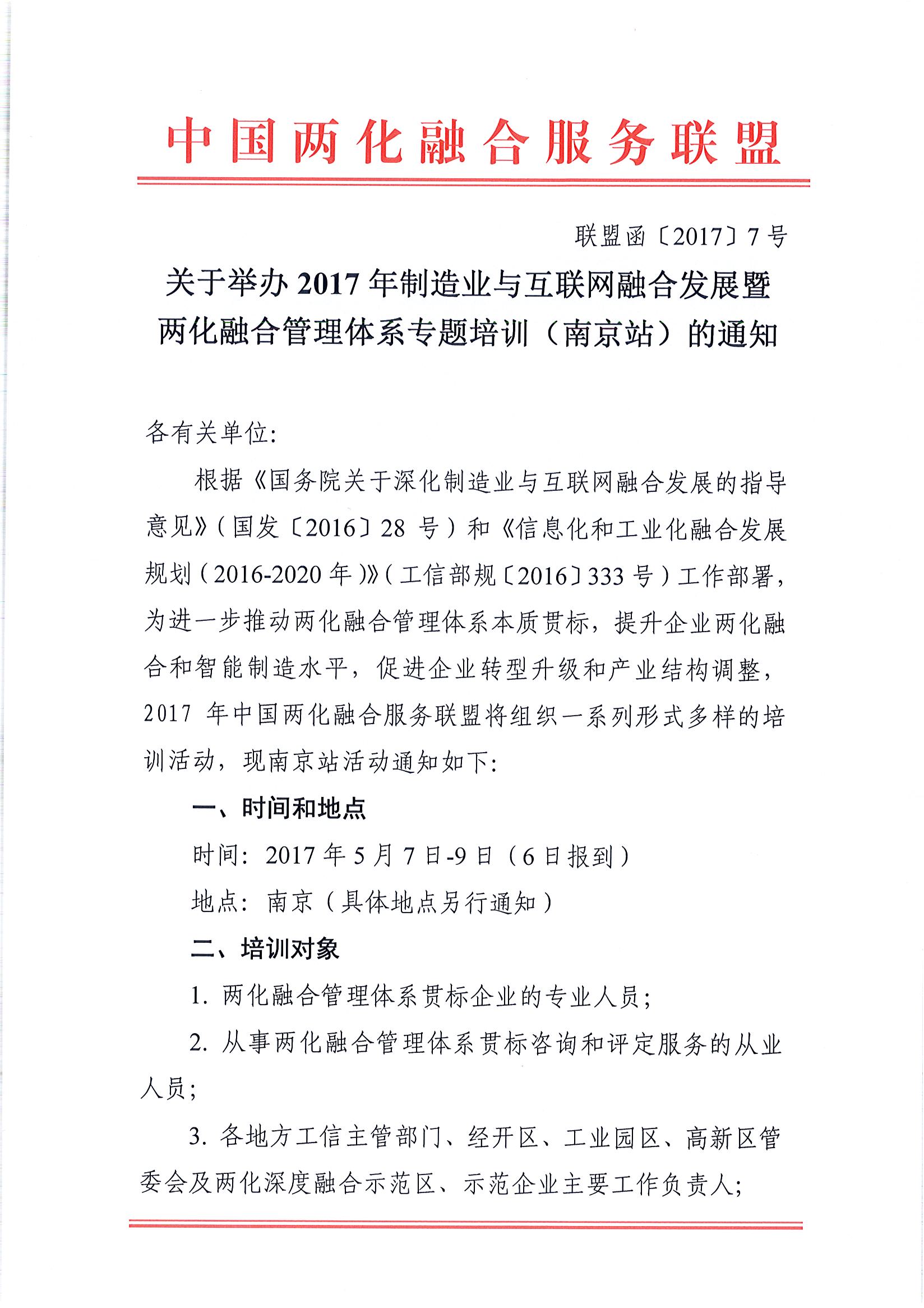 关于举办2017年制造业与互联网融合发展暨两化融合管理体系专题培训(南京站)的通知