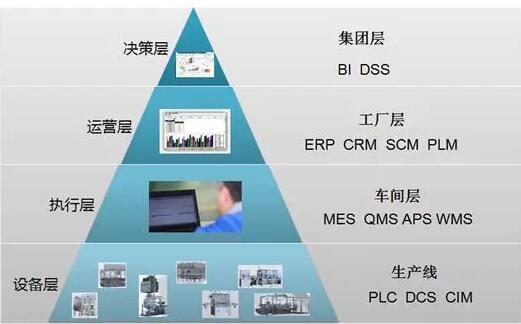 智慧工厂全面集成现代装备制造企业的生产管理、设备管理、安全管理,系统兼容所有智能设备,深度融合工业物联网技术,支持各种串口通讯协议和无线通讯协议。系统通过统一的平台管理各种设施设备,获取各类数据信息,联动各类预警、报警系统。提供可定制可扩充的各类业务服务模块和各类数据报表服务模块,提供面向用户个性化需求的深度数据挖掘与分析,实现了企业整体运作的高效、安全、节能。图2展示了智慧工厂的基本架构,基本包括决策层、运营层、执行层和设备层等四层,相对应的服务对象是集团层、工厂层、车间层和生产线。处在最上层的是商业智能和决策执行系统,即BI和DSS;处在第二层的是与生产计划、物流、能源和经营相关的ERP、CRM、SCM等,以及产品设计、技术相关的PLM;处在第三层的是与制造生产设备和生产线控制、仓库管理相关的MES、QMS、WMS功能;处在最下层的是感知层,也是至关重要的一层,我们的数据通过设备层的PLC、DCS传出,实现产品信息的采集以及追溯等等。