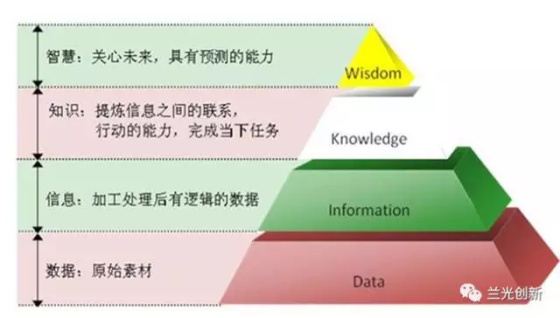 从上图可以看出,最底层是数据层(原始数据),然后是信息层(有逻辑的数据),再上面是知识层,最上面是智慧层。
