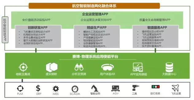 一是新技术支撑 IT/OT融合。基于物联及集成、虚实映射、分析及预测、用户体验、大数据管理等新技术,实现设备、车间、企业级的垂直集成,重点解决异构设备互联、设备 /系统的互联、大数据管理等关键能力。其中,PLM、ERP、MES等 传统IT应用体系将与数据采集与监控系统(SCADA)、硬件设备、物理飞机等运营技术(OT)体系进行融合,以打通数字化和物理运营环节,为业务转型优化提供基础支撑。