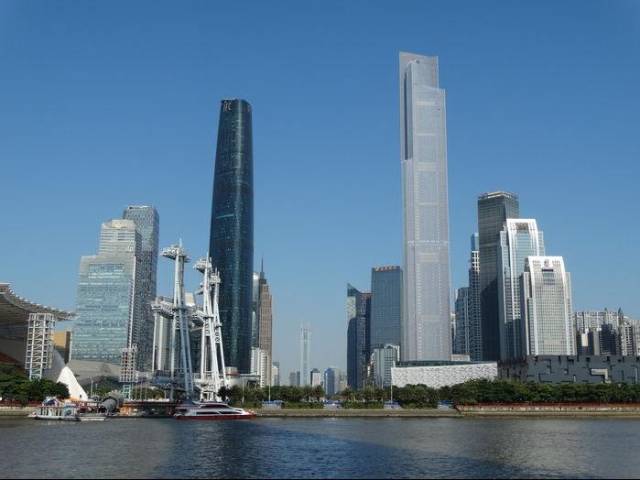 广州珠江新城东塔与西塔和电视塔相互辉映,共同构筑广州城市中轴线国际水平的地标建筑群。