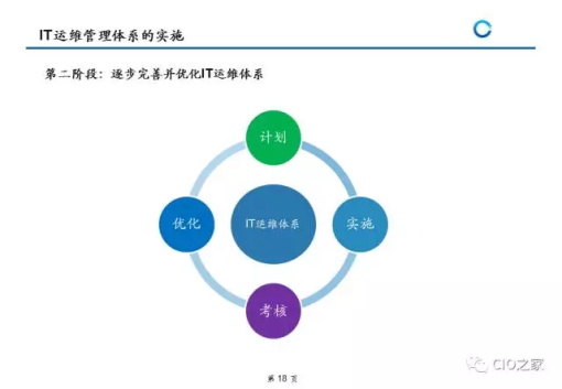 第四阶段:持续改进阶段。因为IT运维管理是一个不断持续满足用户需求和期望的过程,所以IT运维管理体系的建设应该是一个不断持续改进的过程,整个过程包括计划(Plan)、执行(Do)、检查(Check)和行动(Action4个阶段(PDCA),并按此顺序不断循环改进, 通过PDCA的管理思想,定期地对运维流程进行分析,提出 优化和改进建议,使运维流程随着组织内外部环境的不断 变化而改进,保障运维流程动态满足企业的业务目标。