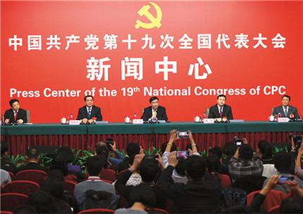10月19日晚,十九大新闻中心在梅地亚新闻发布厅举办主题为“走新型工业化道路”集体采访活动。工业和信息化部党组书记、部长苗圩,中国电信集团公司党组书记、董事长杨杰,山东省经济和信息化委员会党组书记、主任钱焕涛,北京汽车集团有限公司党委书记、董事长徐和谊出席了发布会。