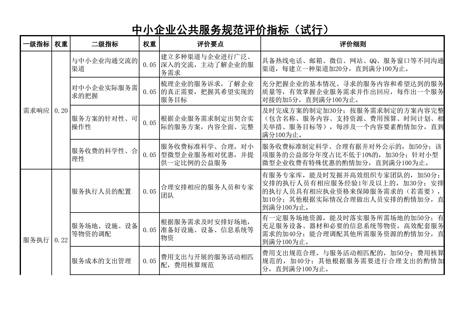 为提升中小企业公共服务质量、规范中小企业公共服务、改善中小企业公共服务环境,制定《中小企业公共服务规范评价指标(试行)》。现印发你们,请遵照执行。有关事项通知如下: