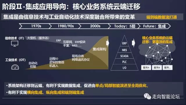过去几十年, 信息技术(IT)和工业技术(OT)沿着各自不同的轨道在发展,系统架构迁移到云端将打破传统企业五层架构,有利于实现工业4.0所强调的横向集成、纵向集成和端到端集成,促进单点智能演进至全局优化。
