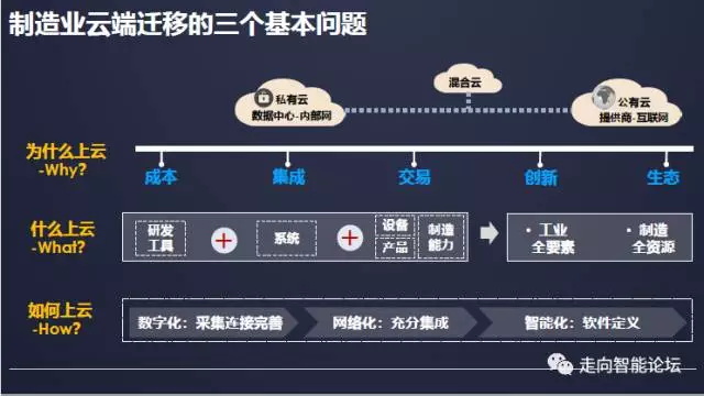 近几年,工信部一直在开展两化融合管理体系贯标工作, 8万家企业的自评估、自诊断、自对标结果显示,企业两化融合投入和企业两化融合收益并不是线性关系,企业两化融合水平只有达到集成阶段之后,企业的收益才会呈现指数化的增长,对于不少中小企业而言,这是一个挑战。那么如何实现集成呢?其一是渐进的路径,即不改变现有的技术架构,不断地通过API接口实现不同业务系统之间的互联互通;其二则是工业云这一激进路径,即企业将业务系统迁移到云端,从而解决系统内部的互联互通问题。