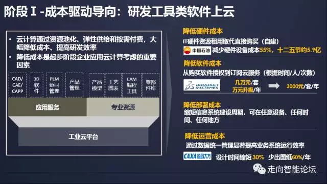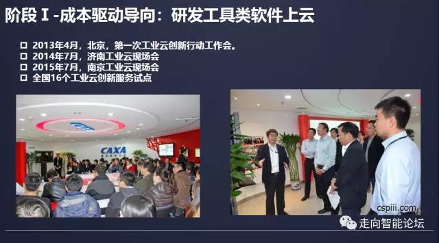 工业云发展第一个阶段是成本驱动导向的阶段,主要是研发设计类工具上云。云计算具有资源池化、弹性供给、按需付费等典型特征,能大幅降低企业购买研发工具的成本,提高企业研发效率,因此,降低成本是工业云平台起步发展阶段考虑的重要因素。工信部2013年4月、2014年7月、2015年7月连续3年分别在北京、济南、南京召开工业云现场会,在全国开展了16个工业云创新服务试点。前几年,业界讨论工业云,关注的重点问题都是企业如何通过云计算降低IT硬件成本、软件成本、部署成本、运营成本。