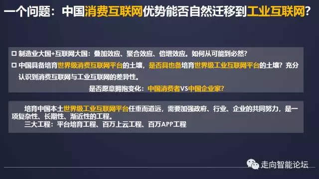 最后,值得我们思考的是,中国消费互联网优势能否自然迁移到工业互联网呢?《深化制造业与互联网融合发展的指导意见》指出我们是制造业大国,也是互联网大国,两个大国的优势叠加可以形成叠加效应、聚合效应、倍增效应,但是如何才能做到从可能到必然呢?我们具备了培育世界级消费互联网平台的土壤,但是否也具备培育世界级工业互联网平台的土壤呢?我们要充分认识到消费互联网与工业互联网的差异性。为什么会有这么多的消费互联网平台进入到世界级行列呢?原因有很多,其中最重要的原因是在于改革开放三四十年,社会心理形成一种状态愿意拥抱变化,个人消费者愿意拥抱变化,但是对工业企业来说我们是否也愿意拥抱工业云来的变化呢?培育中国本土世界级工业互联网平台任重而道远,需要加强政府、行业、企业的共同努力,这是一项复杂性、长期性、渐近性的工程,工信部将通过工业互联网平台培育工程、百万制造业企业上云工程、百万工业APP工程推进此项工作。