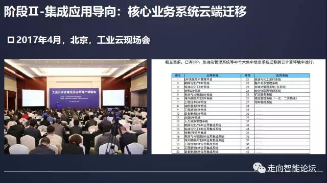 2017年4月18日,工信部在中石油召开工业云现场会,与前几次现场会工业云关注的焦点是降低成本相比,本次现场会企业讨论的重点是如何通过企业内部核心业务系统向云端迁移,实现企业内部的系统集成。比如,中石油指出,将企业40个业务系统迁移到云端,有成本的考虑,更多的考虑是实现内部的集成。