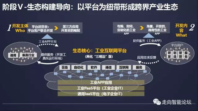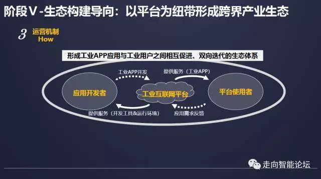 和创新引领阶段相比,主要表现为三方面变化,一是开发主体(who)从“平台运营者+平台客户”联合开发演进为海量第三方开发者;二是开发内容(what)从有限、封闭、定制化的工业APP演进为海量、开放的、通用性的工业APP;三是运营机制(how)在演进,核心是形成工业APP应用与工业用户之间相互促进、双向迭代的生态体系。