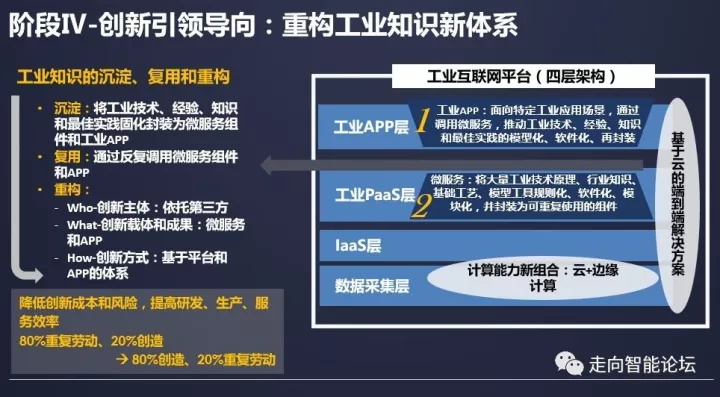 第四个阶段是创新引领导向的阶段,在企业研发设计类工具、核心业务系统、底层的设备和产品开始上云之后,制造业架构体系发生了革命性变革,“云计算+边缘计算”成为计算能力新组合,微服务架构成为知识经验封装的新模式,工业app成为新型软件形式。工业互联网平台的四层架构日渐清晰,数据采集层、IaaS层、工业PaaS和工业APP层共同构成了基于云的端到端制造业数字化、网络化、智能化整体解决方案,看起来是云,背后是面向线下的一套解决方案。