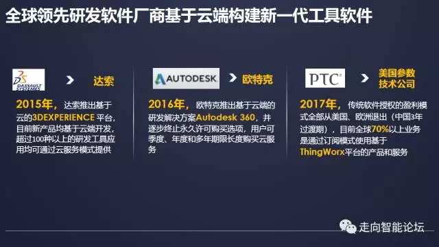 当前,为确保市场竞争优势,全球领先的研发软件厂商纷纷基于云端构建新一代的工具软件,推动工具类软件向云端迁移。达索2015年推出基于云的3DEXPERIENCE 平台,目前新产品均基于云端开发,超过100种以上的研发工具应用均可通过云服务模式提供。欧特克2016年推出基于云端的研发解决方案Autodesk 360,并逐步终止永久许可购买选项,用户可按季度、年度和多年期限购买云服务。PTC2017年将传统软件授权的盈利模式全部从美国、欧洲退出(中国3年过渡期),目前全球70%以上业务通过订阅模式使用基于ThingWorx平台的产品和服务。
