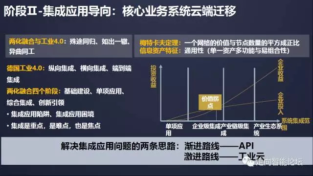 中国国际工业博览会工业互联网产业发展(上海)论坛在上海举行,工信部信软司副司长安筱鹏参加会议并作题为“从工业云到工业互联网平台演进的五个阶段”主旨演讲,指出工业云向工业互联网平台的演进将经历成本驱动导向、集成应用导向、能力交易导向、创新引领导向和生态构建导向五个阶段。安筱鹏表示,近几年,工信部一直在开展两化融合管理体系贯标工作, 8万家企业的自评估、自诊断、自对标结果显示,企业两化融合投入和企业两化融合收益并不是线性关系,企业两化融合水平只有达到集成阶段之后,企业的收益才会呈现指数化的增长,对于不少中小企业而言,这是一个挑战。那么如何实现集成呢?其一是渐进的路径,即不改变现有的技术架构,不断地通过API接口实现不同业务系统之间的互联互通;其二则是工业云这一激进路径,即企业将业务系统迁移到云端,从而解决系统内部的互联互通问题。以下为演讲主要内容。