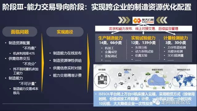 当前生产能力的交易主要面临着三大问题:一是制造资源配置不均衡,例如国内机床的利用率只有40%,在很多情况下处于闲置状态,当有大订单来的时候设备又满足不了需要;二是供需信息不充分,当一个企业有了一个大订单需要购买数控机床加工能力时,不知道加工能力在哪里;三是制造能力不可计量,能力交易成本较高。没有计量就没有交易,随着设备上云,制造能力能够实现在线发布、制造资源可以弹性供给、供需信息能够实时对接、能力交易也可以精准计费,这为解决上述问题提供了可能。