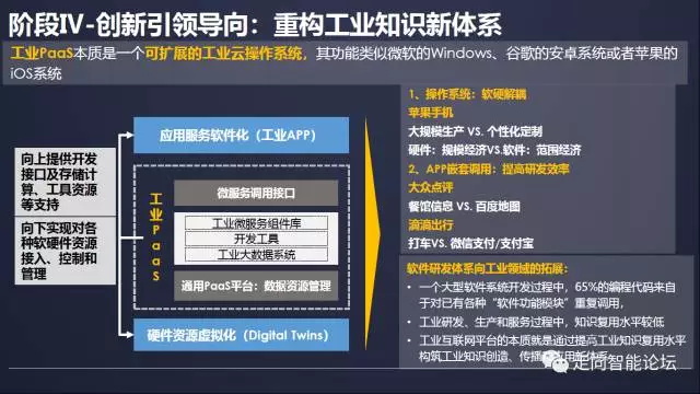 在该阶段,“工业paas平台+定制化开发工业APP”成为平台竞争的焦点,并在重构工业知识新体系。其中,工业PaaS层的核心是把大量的工业技术原理、行业知识、基础工艺、模型工具规则化、软件化、模型化,封装成为可重复使用的微服务组件。工业APP层的核心是面对特定的工业场景,通过调用底层的微服务,推动工业技术、经验、知识和最佳实践的模型化、软件化与再封装。