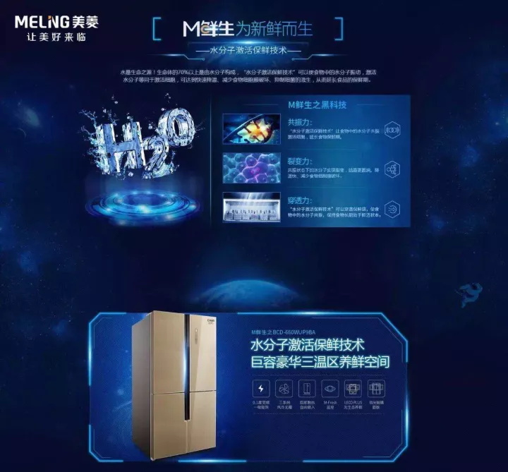 M鲜生冰箱搭载了美菱最新研发的水分子激活保鲜技术,该技术通过振动食物中的水分,从而激活水分子;被激活的水分子产生共振力、裂变力、穿透力三种力,能够降低酶的活性、减少对细胞膜的破坏、减少汁液的流失,解决了保鲜时间短、解冻血水多、袋装保鲜差的消费痛点。