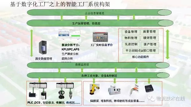 架构的第二层,在工业生产这个环节,最关键的是工艺数据。不同的产品有不同的生产工艺和工艺参数配方,工艺数据的获得是实现数字化工厂的基础,没有数据,数字化工厂不可能实现,更不可能实现智能工厂。那么,生产工艺数据如何获得呢?这就要看工厂运维管理信息化和制造执行(MES)系统是怎么建设的,生产设备之间的握手,工艺参数的自动控制与设备的实施交互,这是很多工厂难以做到,有些工厂甚至是关键的工艺配方掌握在少数人的手里,而这些人是根据几十年的工作经验来调工艺参数,这就导致了历史数据非常少或不均衡,无法建立数学模型,难以实现数字化工厂的目标。那么,这个问题又如何解决呢?我认为最好是按两个步骤来解决,第一步先解决数据采集问题,也就是生产数据的SCADA,然后尽最大可能建设MES系统,基本数据系统自动管理,关键参数人为干预。