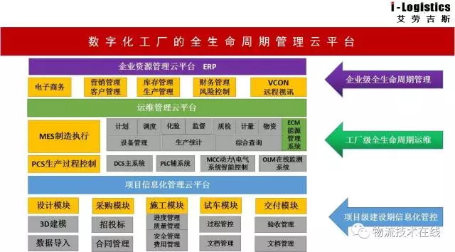 这个架构的第一层所表达的是数字化工厂的建设是从一开始建立工厂的时候,在设计阶段就开始进入信息化管理平台,所有设计是基于3D建模的,数据是可以导入项目信息化管理平台的,项目实施全过程都有数据,使项目做到全生命周期数字化管理,这是数字化工厂的基础。