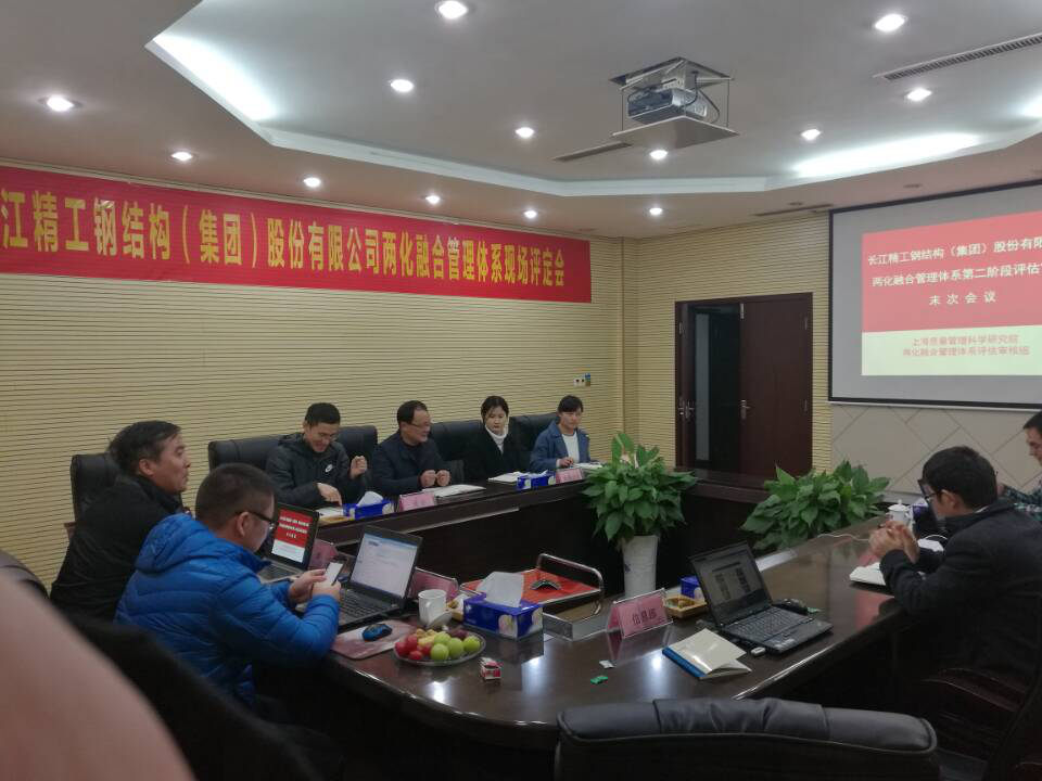 末次会议上,评审专家组林铧组长宣布长江精工钢结构(集团) 股份有限公司通过两化融合管理体系二阶段现场评审,并感谢长江精工在评审过程中给与的配合。林老师举了大量的贯标运行实例,对钢结构行业做了系统分析,也对企业存在的一项不符合项和建议项进行了深刻的阐述。