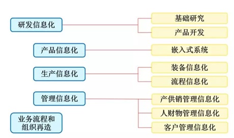 制造业信息化的发展,主要是围绕着企业的业务运行而展开。首先是企业内部信息化,见图1。这包括“四化一再造”,也就是研发信息化、产品信息化、生产信息化、管理信息化以及业务流程和组织再造。其中产品信息化,主要是指带有嵌入式系统的产品,其复杂程度各不相同。理解产品信息化,对理解当下的智能制造,非常重要。