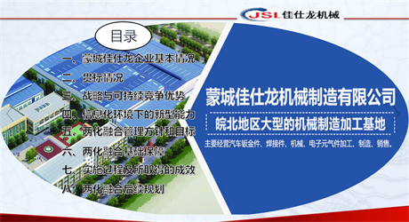 两化融合是企业获取与战略匹配的可持续竞争优势的必然过程。通过两化融合管理体系标准的持续深入贯彻,推动企业实现可持续发展目标,其意义重大。为认真贯彻落实工信部两化融合管理体系贯标的要求和蒙城县经信委的十三五行动方案,结合佳仕龙机械制造公司的实际情况,努力打造企业信息化环境下的新型能力,实现企业可持续发展。成立了以总经理亲自挂帅的两化融合领导组,公司高管、中层、部门、车间、岗位均有贯标责任人和信息化系统实施负责人,充分发挥内审人员的作用。