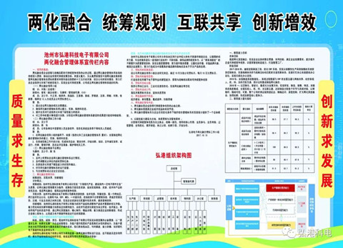 两化融合是企业获取与战略匹配的可持续竞争优势的必然过程。通过两化融合管理体系标准的持续深入贯彻,推动企业实现可持续发展目标,其意义重大。为认真贯彻落实工信部两化融合管理体系贯标的要求和池州市经信委的十三五行动方案,结合池州市弘港科技电子有限公司的实际情况,努力打造企业信息化环境下的新型能力,实现企业可持续发展。成立了以总经理亲自挂帅的两化融合领导组,公司高管、中层、部门、车间、岗位均有贯标责任人和信息化系统实施负责人,充分发挥内审人员的作用。