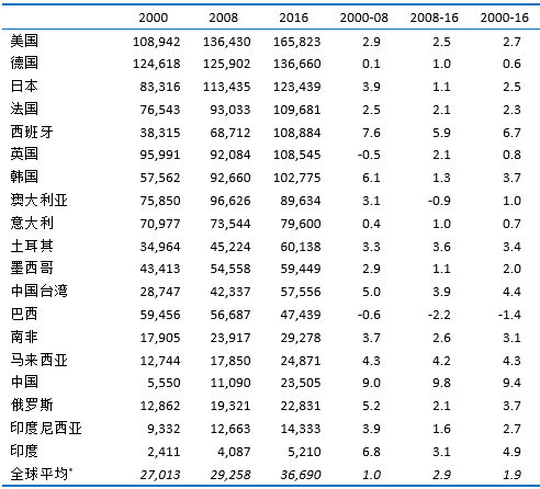 表2 主要经济体制造业劳动生产率水平(美元)及分时期年复合增长率(%)(劳动生产率以2010年美元计算,按照2016年水平排序)