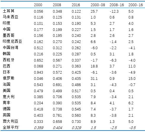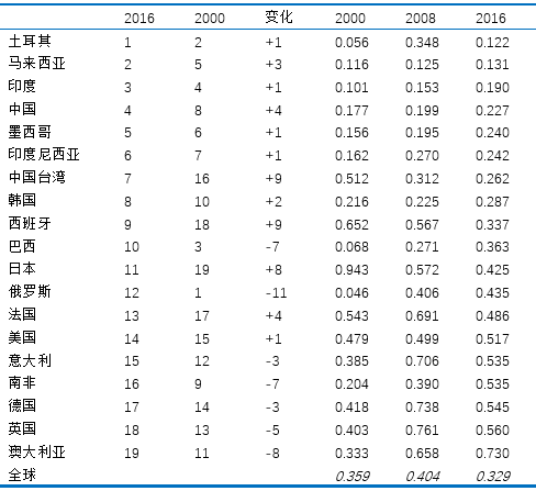 表5 主要经济体制造业竞争力(ULC)排名及水平2000-2016(ULC值越低,排名越高)