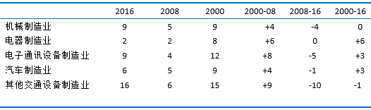 从行业单位劳动力成本竞争力的排名来看,虽然从2000年至2016年中国的排名整体上升,但主要的成就都来自于危机前的阶段。2000年至2008年,5个行业单位劳动力成本竞争力排名均出现了明显上升,但在2008年至2016年,除了电器制造业排名持平,其他各行业的竞争力排名都出现了下降。