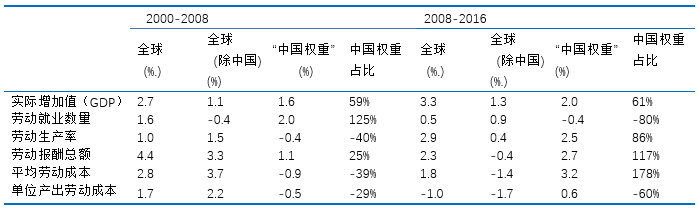 从2000年到2008年,全球制造业增加值以每年平均2.7%的速度增长,其中60%来自就业增长的贡献,中国不仅是全球就业增长的唯一源泉,还补偿了其他经济体就业的净减少。在2000-2008年,中国大规模就业增长将全球制造业的劳动报酬总额推高了三分之一,但也使全球制造业平均劳动成本降低了四分之一。