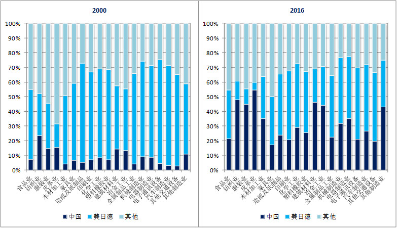 根据第一财经研究院的测算,中国制造业总产出在2005年超越了德国,随后在2008年超越日本,2010年超越美国。截至2016年,中国制造业实际增加值达到2000年的7倍,占全球制造业总产出的比重从8.5%提高到了30.9%。巨大的市场份额不仅意味着规模带来的独特竞争优势,即所谓的“中国权重”,同时也意味着中国制造业的任何变化都会对全球产生重大影响。相比之下,美国、日本和德国在全球制造业的比重分别由2000年的28.5%、17.0%和10.1%,下降到19.3%、11.6%和7.0%。
