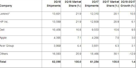 随着联想与富士通(Fujitsu)组建的合资企业成立,在2018年第二季度,全球五大PC厂商的出货量仍占全球总出货量的四分之三。基于全球PC发货量,联想实际上已经与惠普势均力敌。五大厂商本季度在全球PC出货量都有所增加。