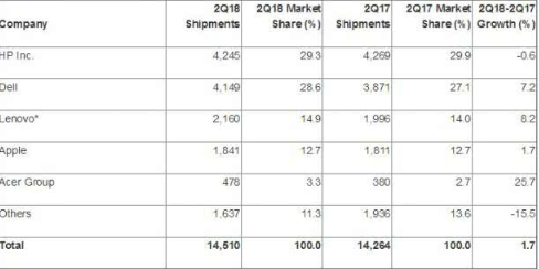 在美国PC市场,该行业在连续6个季度出货量下降后重新恢复增长。2018年第二季度,美国PC发货量总计1450万台,较去年同期增长1.7%。虽然惠普公司依然是美国PC市场的领导者,但随着戴尔在美国市场PC发货量增长了7.2%,后者正缩小与惠普的差距。