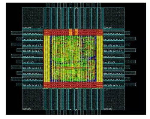 最后,将合成完的程式码再放入另一套 EDA tool,进行电路布局与绕线(Place And Route)。在经过不断的检测后,便会形成如下的电路图。图中可以看到蓝、红、绿、黄等不同颜色,每种不同的颜色就代表着一张光罩。至于光罩究竟要如何y运作呢?