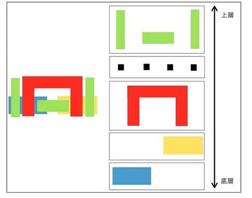 首先,在这裡可以将红色的部分比拟成高楼中的一楼大厅。一楼大厅,是一栋房子的门户,出入都由这裡,在掌握交通下通常会有较多的机能性。因此,和其他楼层相比,在兴建时会比较复杂,需要较多的步骤。在 IC 电路中,这个大厅就是逻辑闸层,它是整颗 IC 中最重要的部分,藉由将多种逻辑闸组合在一起,完成功能齐全的 IC 芯片。