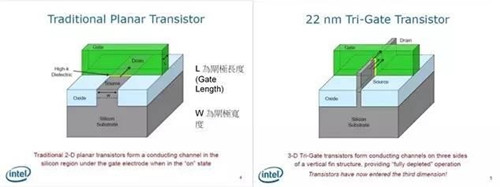 不过,制程并不能无限制的缩小,当我们将电晶体缩小到 20 纳米左右时,就会遇到量子物理中的问题,让电晶体有漏电的现象,抵销缩小 L 时获得的效益。作为改善方式,就是导入 FinFET(Tri-Gate)这个概念,如右上图。在 Intel 以前所做的解释中,可以知道藉由导入这个技术,能减少因物理现象所导致的漏电现象。