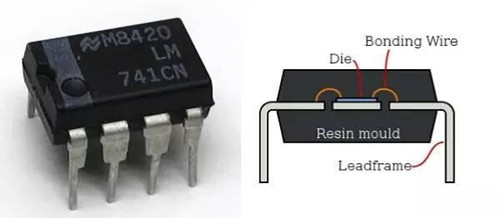 ▲ 左图的 IC 芯片为 OP741,是常见的电压放大器。右图为它的剖面图,这个封装是以金线将芯片接到金属接脚(Leadframe)。(Source :左图 Wikipedia、右图 Wikipedia)
