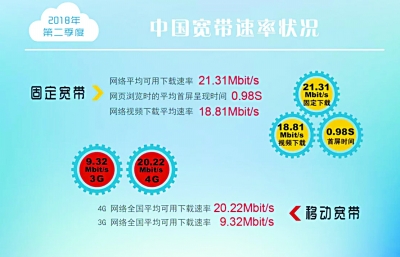 7月26日,宽带发展联盟发布了第20期《中国宽带速率状况报告》(2018年第二季度)。报告显示,2018年第二季度我国固定宽带网络平均下载速率达到21.31Mbps,比2017年第二季度提升51.0%;我国移动宽带用户使用4G网络访问互联网时的平均下载速率达到20.22Mbps,比2017年第二季度提升50.2%。2018年第二季度,我国固定宽带和4G网络用户下载速率双双超越20Mbps,同期网络视频下载速率也有较大幅度的提升。