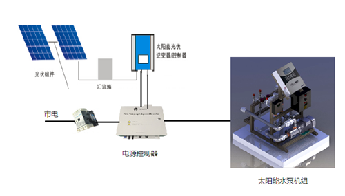人类赖以生存的能源越来越少,随着不可再生资源的枯竭,不断寻找新的能源是世界人民的共同努力,充分利用太阳能,发展绿色能源,是国家重点支助的产业之一。公司研发团队提出研发一套基于太阳能的一体化泵站的设想,与天津理工大学进行产学研合作,我公司主要负责太阳能机组的研发,天津理工大学主要负责光伏控制器和电源切换器的研发。系统采用双路供电的方式,太阳能充足可以用太阳能供电,阴雨天太阳能供不了可以自动切换到市政电网,太阳能双能源自动切换可以摆脱只能依托于市政电网来运行的设备,达到利用太阳能达到节能目的,广泛以用于农业灌溉、牧场供水、西部光照充足地区等领域,系统拓扑图如下所示。