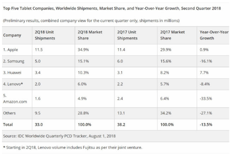 三星的平板电脑出货量与去年同期相比减少了100万,市场份额损失了0.5%,从15.6%降至15.1%。虽然三星的平板电脑和可拆卸式产品出货量下滑,但由于该公司刚刚发布了全新一代的Galaxy Tab S4旗舰产品,因此下一季度出货量可能会有反弹。