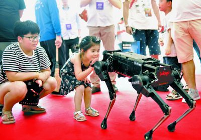 昨天,世界机器人大会在北京亦创国际会展中心开幕,博览会上一只可爱卖萌的四足犬型机器人引起了孩子们强烈的好奇。 和冠欣摄