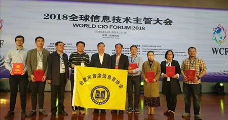 (工信部两化融合推进处王建伟处长、中国人民大学张斌院长(中)与王董和合肥市首席信息官协会会长宋谠等受表彰的全国优秀CIO合影)
