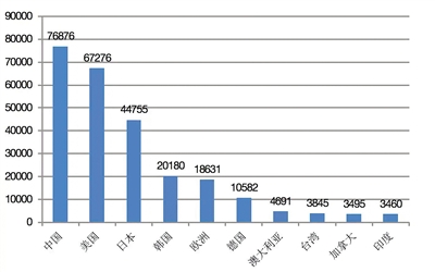 DWPI数据库统计显示,全球范围内,人工智能领域的专利申请量总体上呈逐年上升趋势,在2010年后增长速度明显加快,近两年的增长率也不断提高。其中,申请量排名前三位的依次为中国、美国、日本。目前,中国在人工智能领域的专利申请数量达到76876件。美国以67276件的申请量略低于中国,日本位列第三。