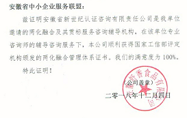 其实在两化融合管理体系证书还没有下来之前,荣获全国优秀CIO的安徽兴安电气设备股份有限公司钱总经理在西安的全球信息技术主管表彰大会上就表达了对安徽省新世纪认证咨询有限责任公司贯标辅导服务工作的称赞:新世纪的两化融合辅导老师个人作风过硬、能力棒棒、态度和蔼,是我们两化融合工作的指路人和创业创新的启迪高手。